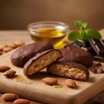 | COMPOSICION-INGREDIENTES | Harina de TRIGO, azúcar, aceite de oliva (22%), ALMENDRAS (4%), SESAMO y baño de chocolate (3%) (azúcar, grasa vegetal totalmente hidrogenada (palmiste), cacao desgrasado en polvo (18%), suero de LECHE, emulgentes (E-322, E-476 y E-492) y aroma). | |||||||||||||||||||||||||