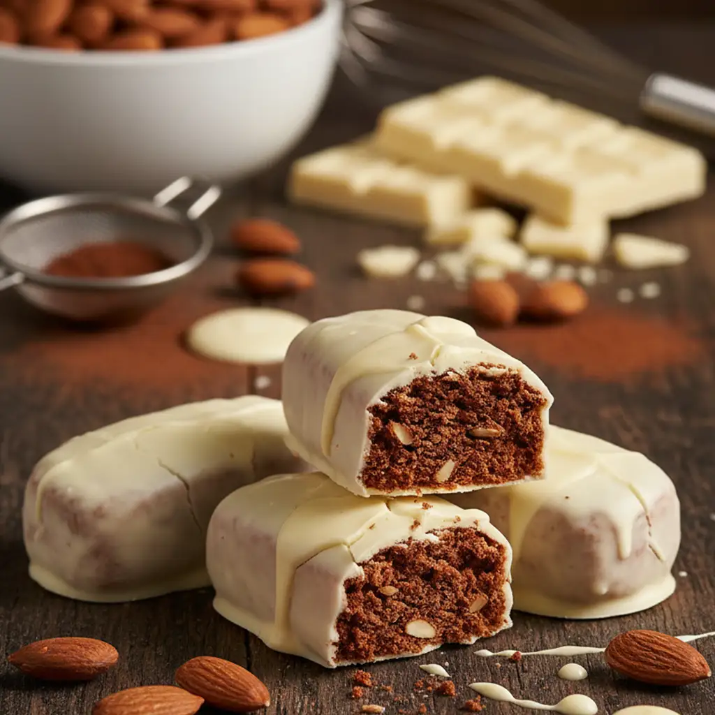 Harina de TRIGO, azúcar, grasa de cerdo ibérico (antioxidante BHA: E-320), ALMENDRAS (8%), cacao (3,8%), SÉSAMO y cobertura chocolate blanco (3%) (azúcar, grasa vegetal totalmente hidrogenada (palmiste), LECHE desnatada en polvo (7,7%), emulgente (E-322) y aroma). |